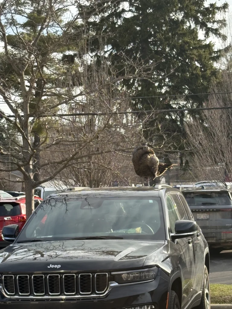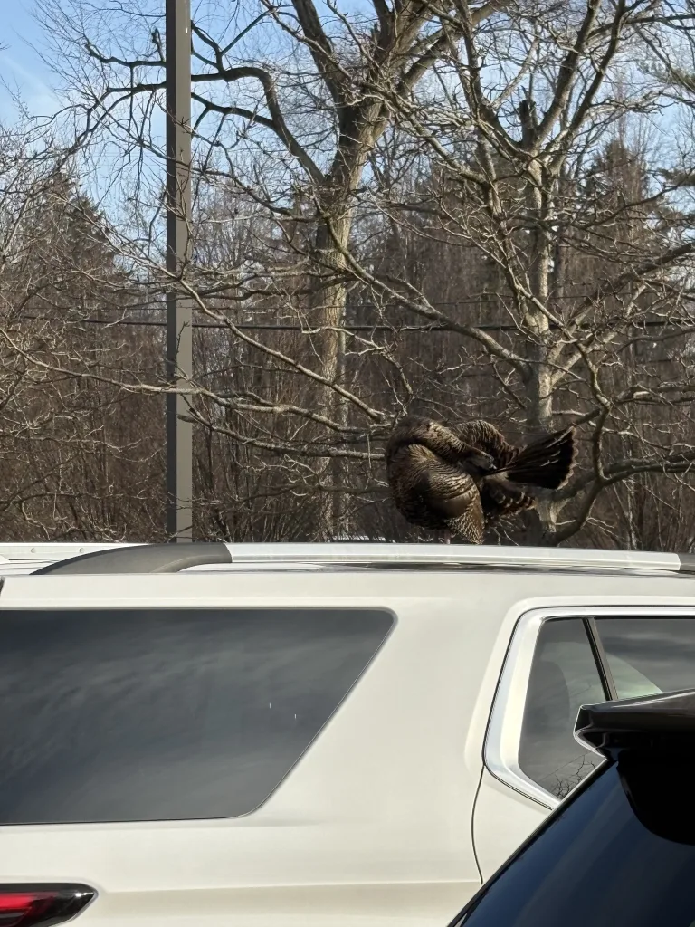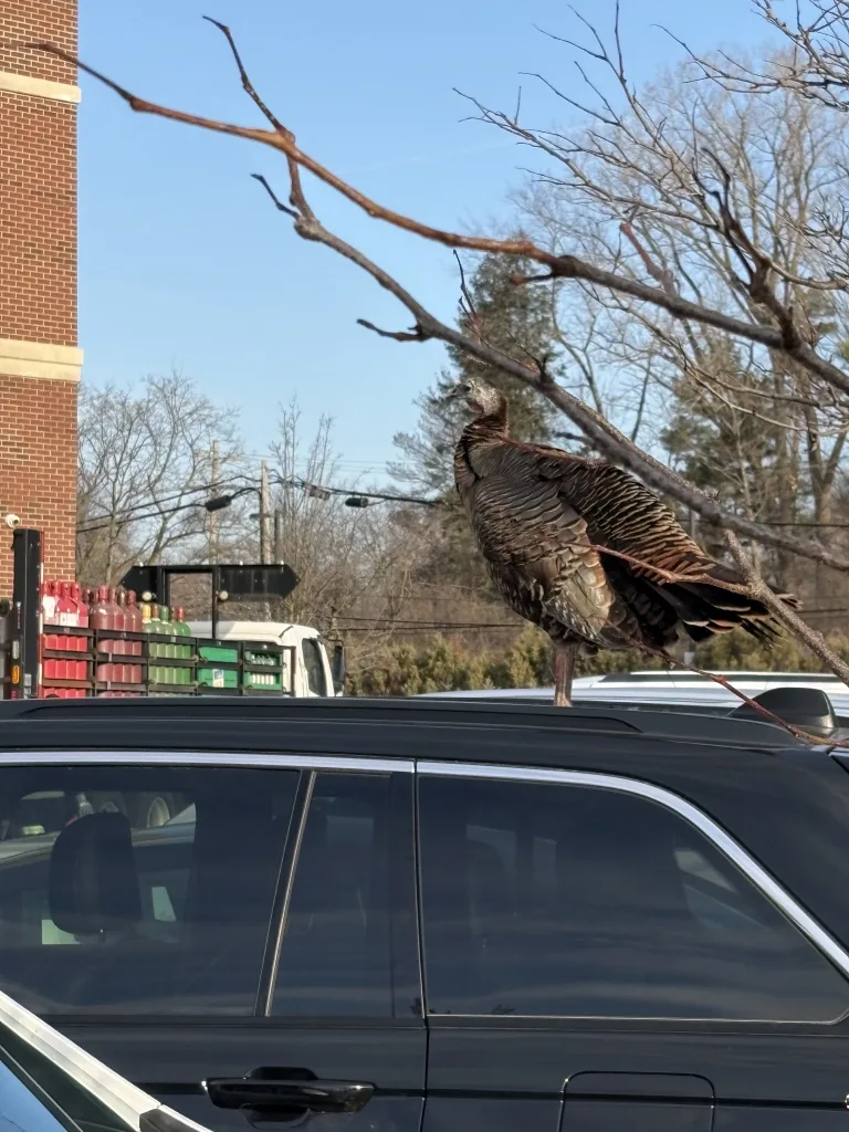 Later that same morning, I stepped outside after dropping off an order, distracted for a moment, and when I looked up, there it was—a turkey standing on top of someone’s car. Calm. Unbothered. Completely out of place, yet perfectly at ease.